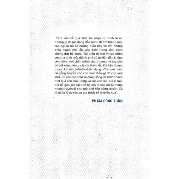 Viết về ký ức phải chăng chỉ là sự trốn chạy thực tại? Tôi không nghĩ mọi chuyện đơn giản như vậy. Khi viết về quá khứ, tôi nhận ra mình là ai, những gì đã tác động đến mình để trở thành một con người đủ cả những điều hay và dở, những điều mạnh mẽ lẫn yếu đuối trong tính cách không dứt bỏ được. Tôi hiểu rõ hơn vì sao mình yêu tha thiết một thành phố dù nó dần dần không còn giống nơi chốn mình yêu thương, vì sao gắn bó với xóm giềng, cây cỏ, thời tiết, khí hậu chung quanh khi tất cả đã dần biến dạng, và vì sao, luôn cố gắng truyền cho con một điều gì đó của quá khứ, dù các con thật ra đang sống để hình thành một quá khứ cho tương lai của các con. Đó là mật mã để gắn kết các thế hệ mà nhiều khi mong muốn truyền đi như một thứ bản năng có sẵn. Có lẽ đó là lý do các cụ già thích kể chuyện xưa.