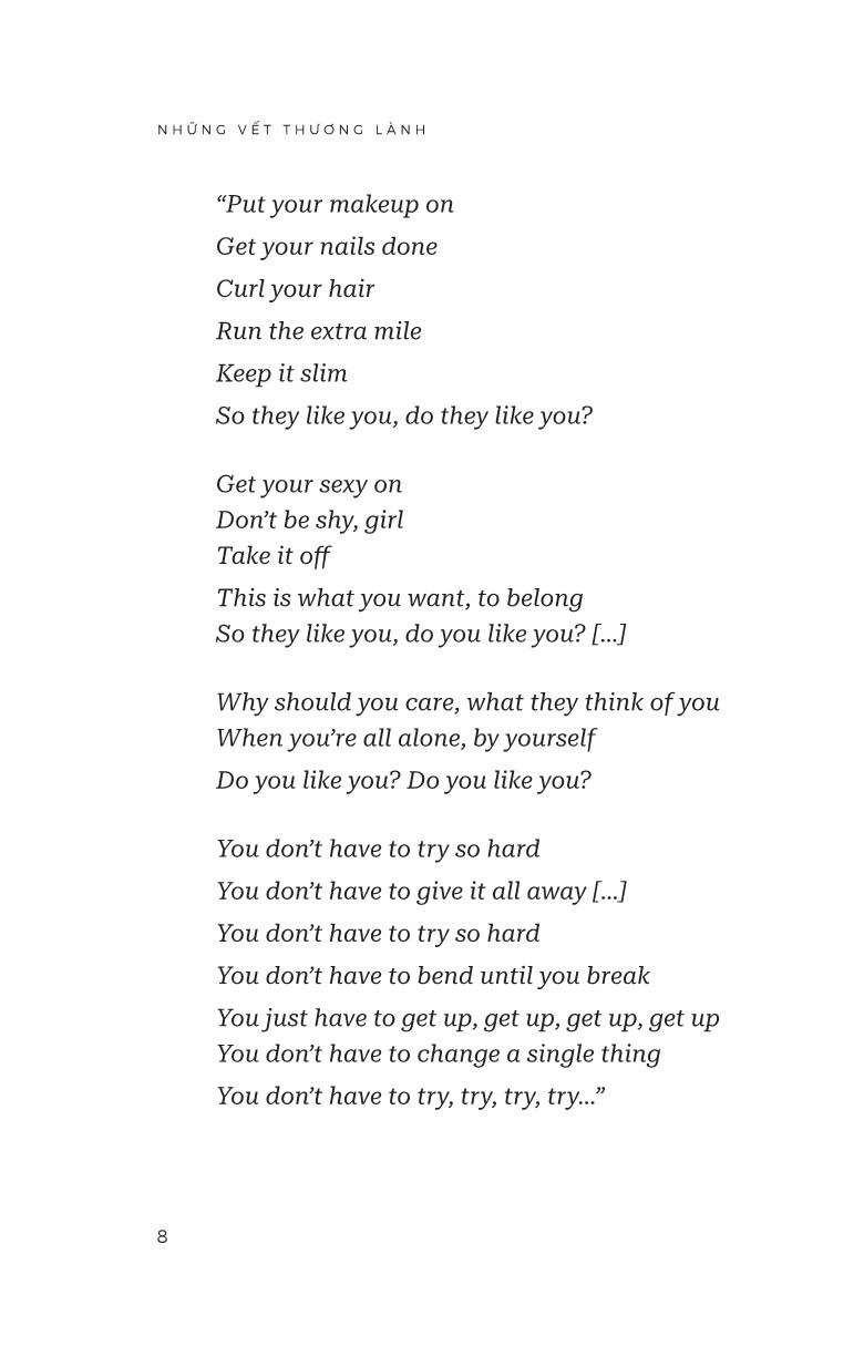 Đi qua nỗi đau không nhất thiết phải là lành lặn và không còn cảm thấy đau chút nào nữa. Những vết thương lành vẫn sẽ để lại sẹo, có những cơn đau vẫn âm ỉ những lúc trái gió trở trời. Nhưng chúng ta giờ đã khác - đã có thể yêu thương, thấu hiểu và ôm ấp tất cả. Cơn đau rồi cũng sẽ qua. Mọi thứ rồi sẽ ổn. Tôi tin là như thế.