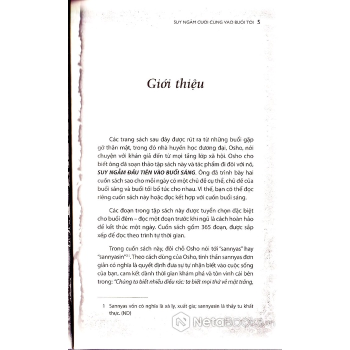 Bạn chỉ cần tìm cho mình chút thời giờ vào buổi tối để ngồi yên lặng, với bản thân, và đọc đoạn văn được gợi ý cho ngày hôm đó. Những đoạn trích trong sách, và trong tác phẩm đi cùng là SUY NGẪM ĐẦU TIÊN VÀO BUỔI SÁNG được lấy từ các cuộc trò chuyện thân mật, trực tiếp với Osho về nhiều chủ đề như bản chất của phúc lành, niềm hân hoan và thiền.