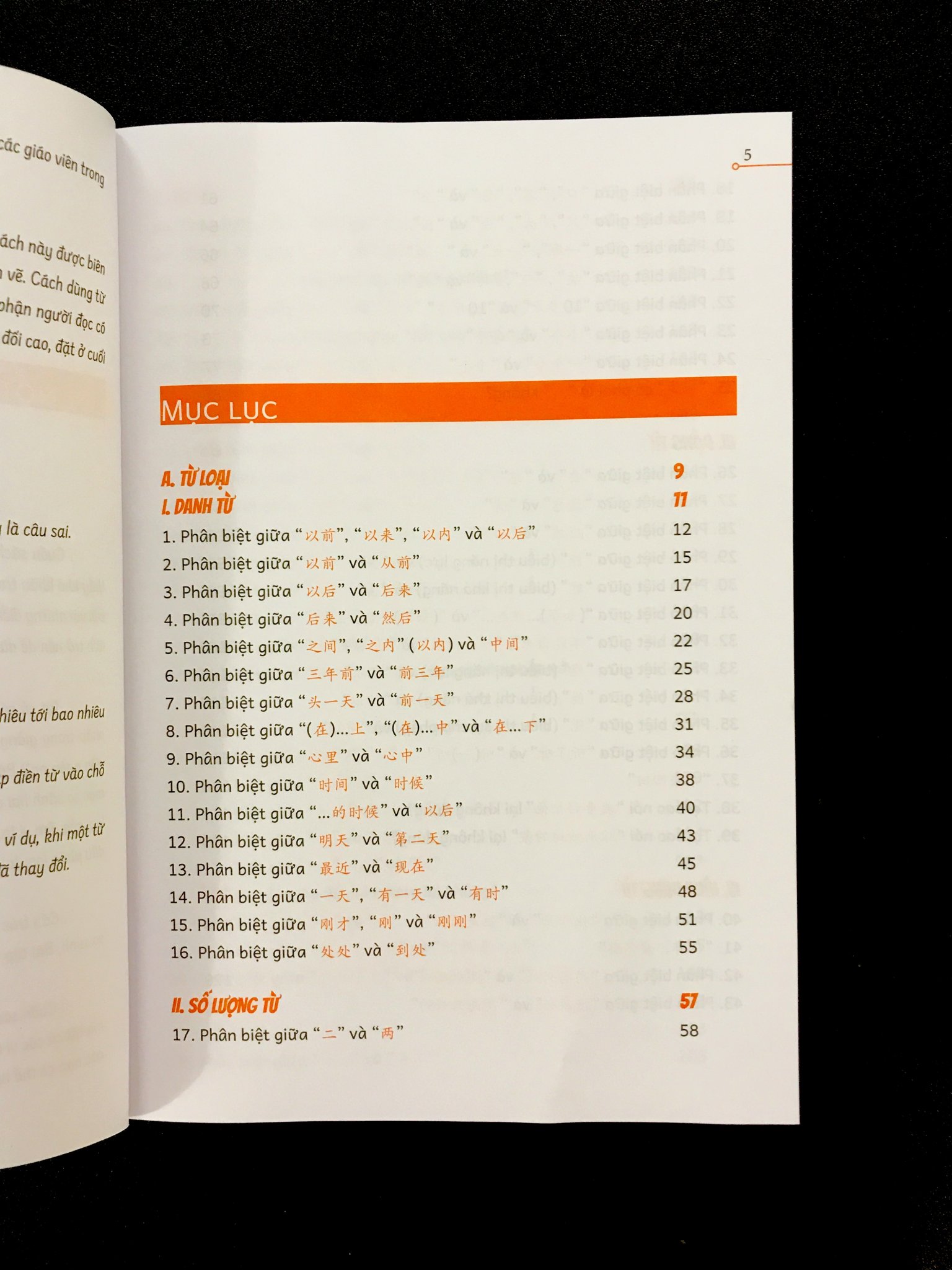 1. Tất cả các mục trong cuốn sách này đều được phân loại và sắp xếp dựa trên “Đề cương ngữ pháp trong giảng dạy tiếng Hán cho người nước ngoài” (Chủ biên Vương Hoàn, Nhà xuất bản Học viện ngôn ngữ Bắc Kinh, năm 1995), song cũng chưa đạt tới mức độ hệ thống toàn diện. Đối với các mục so sánh hai đơn vị ngữ pháp (A & B) có từ loại khác nhau, chúng tôi sắp xếp chúng vào phần từ loại của đơn vị trước (A). Để thuận tiện cho người sử dụng trong quá trình tra cứu, chúng tôi đã đánh dấu phân loại tại phần mục lục.