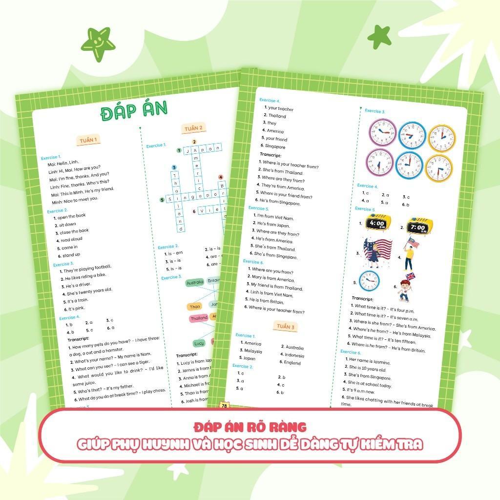 - Hệ thống các bài tập phong phú, mang tính tổng hợp và ôn luyện toàn diện. Hệ thống bài tập đa dạng, lượng phù hợp với việc học cuối tuần để các con vẫn có thời gian thư giãn và vui chơi. Đặc biệt, sau mỗi kì sẽ có bài ôn tập giữa kì và cuối kì giúp con có tài liệu ôn tập cho các kì kiểm tra.