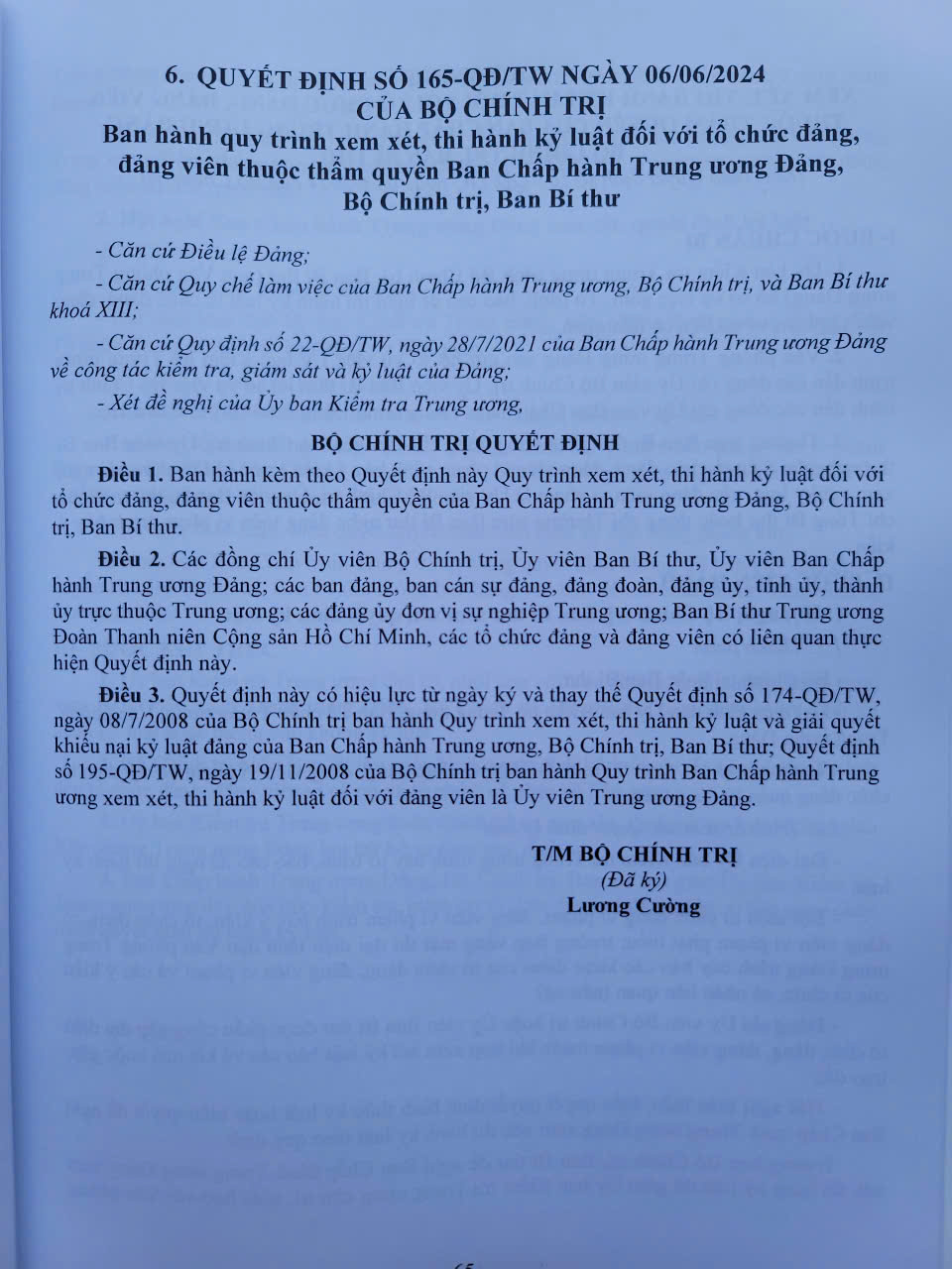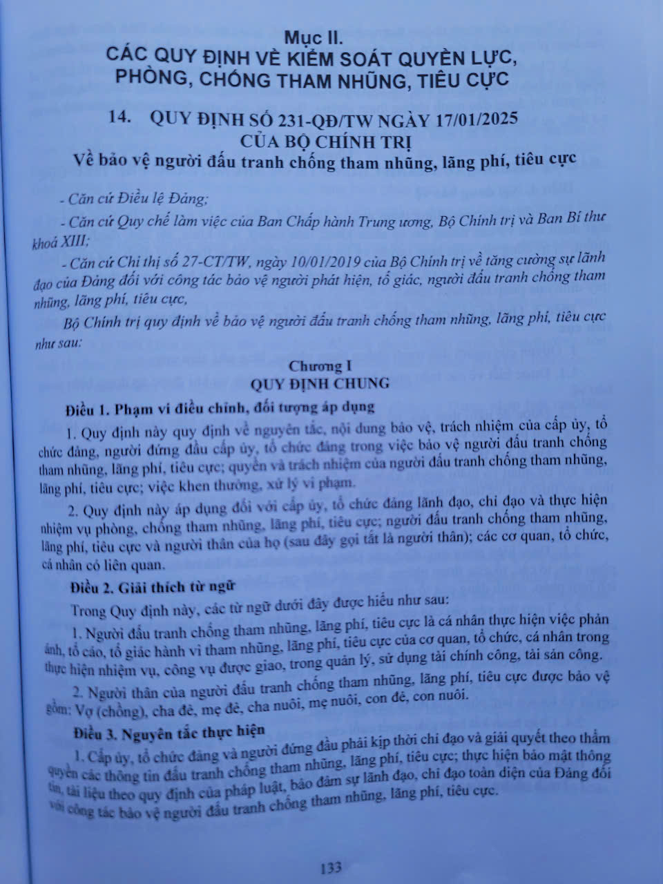 Thời gian qua, nhiều quy định, hướng dẫn của Ban Bí thư, Bộ Chính trị, Ban Chấp hành Trung ương cũng đã được ban hành như: Quy định số 231-QĐ/TW ngày 17/01/2025 Về bảo vệ người đấu tranh chống tham nhũng, lãng phí, tiêu cực, Quy định số 262-QĐ/TW ngày 03/02/2025 Về sửa đổi, bổ sung một số Điều của Quy định số 22-QĐ/TW, ngày 28/7/2021 của Ban Chấp hành Trung ương Đảng về công tác kiểm tra, giám sát và kỷ luật của Đảng…