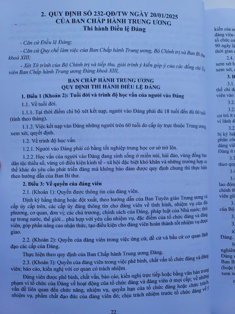 Ngày 20/01/2025, thay mặt Ban Chấp hành Trung ương Đảng, Tổng Bí thư đã ký Quy định số 232-QĐ/TW về việc thi hành Điều lệ Đảng. Cụ thể quy định: Tuổi đời, trình độ học vấn của người vào Đảng; Về quyền, đảng tịch, tuổi đảng của đảng viên; Giới thiệu và kết nạp người vào Đảng; Quản lý thẻ đảng viên, hồ sơ đảng viên; Đảng viên xin miễn công tác và sinh hoạt đảng; Xóa tên đảng viên và giải quyết khiếu nại về xóa tên đảng viên…
