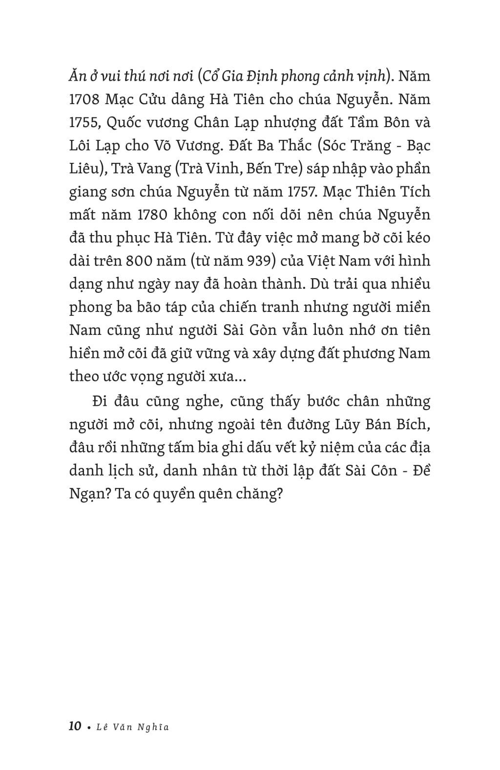 Trải qua hơn ba trăm năm biến thiên lịch sử vật đổi sao dời, vạn bước chân người đi qua đường ngang ngõ dọc, Sài Gòn dần thay màu áo mới, nhiều nơi chốn đã thay tên đổi họ, trở thành hoài niệm với hai chữ “Hồi đó…” vấn vương trong ký ức người cũ. Thước phim thời gian đưa độc giả lần về quá khứ, về với kiến trúc và tàn tích, phố xá và hàng me, rạp hát và cải lương, áo dài và sân trường, sách vở và báo chí… Bước chân đi qua ký ức lại về đến Thành phố Hồ Chí Minh hôm nay, với những con đường lưu đầy dấu xưa chuyện cũ. Hãy lần giở từng trang sách, để bước vào chuyến hành trình ghé thăm những thắng cảnh lịch sử đánh dấu cột mốc hào hùng, lắng nghe âm vang lịch sử còn nhắc lại, hít hà hương thơm cà phê và bát phở sáng của người Sài Gòn, xao xuyến trước tà áo dài xưa mềm mại yêu kiều, đắm chìm trong làn điệu cải lương ngọt ngào da diết... Chuyến hành trình đó mang tên “Sài Gòn - Đi qua ký ức”.