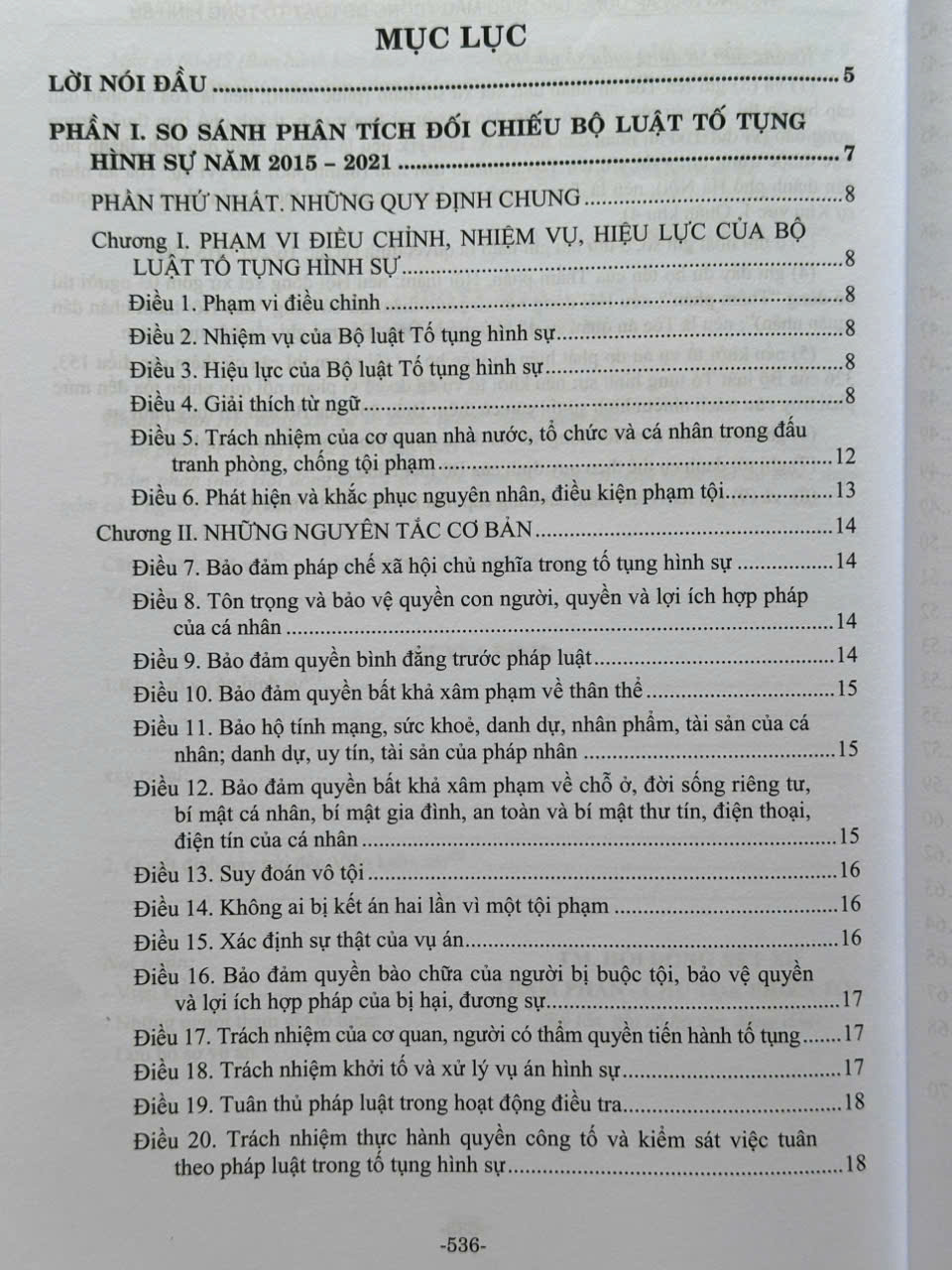 Cuốn sách sẽ giúp bạn đọc thuận tiện trong việc tra cứu, áp dụng Bộ luật Tố tụng hình sự khi so sánh 510 Điều của Bộ luật Tố tụng hình sự năm 2015 với Bộ luật Tố tụng hình sự năm 2015 đã được sửa đối, bổ sung năm 2021.