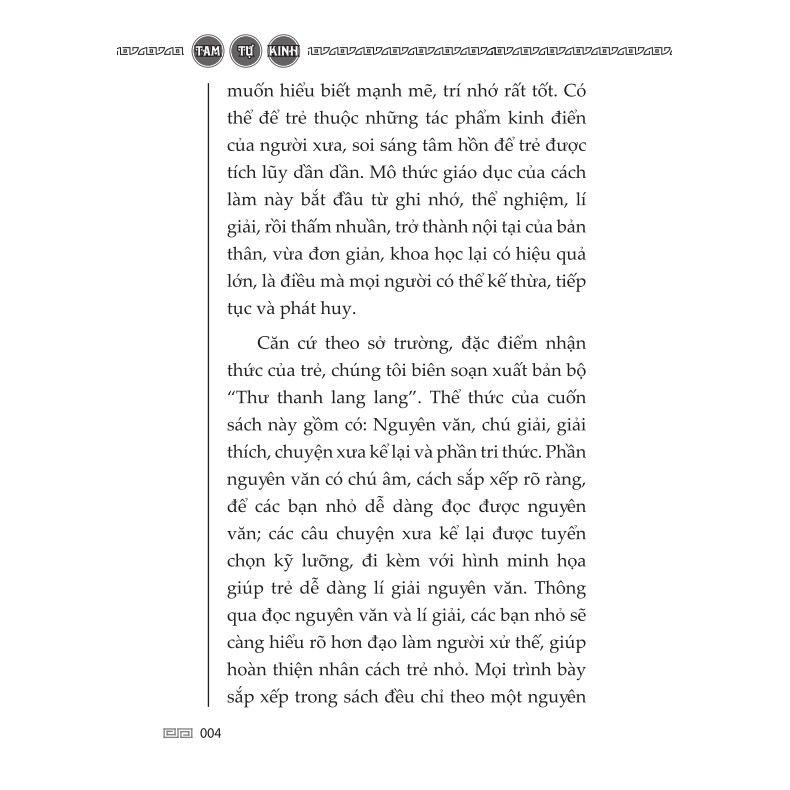 Tác giả: Vương Ứng Lân (đời Tống) Giá bìa: 100.000 ₫ NXB: NXB Dân Trí Phát hành: Minh Thắng Năm xuất bản: 2019 Dịch giả: Phạm Hồng Dạng bìa: bìa mềm Số trang: 300 trang Kích thước: 14,5 x 20,5 cm --------------Giới thiệu sách------------- Đệ tử quy, Tam tự kinh, Thiên tự văn là giáo trình cơ sở khai mở đạo đức truyền thống Trung Hoa. Ba bộ sách này hợp lại thường được gọi chung là Đệ Tam Thiên (cũng gọi là“Thần thánh Đệ tử quy” hay “Thần thánh Thiên tự văn”). “Đệ tử quy”, được ca ngợi là “Nhân sinh đệ nhất bộ, thiên hạ đệ nhất quy”, do Lý Dục Tú biên soạn vào những năm Khang Hy đời Thanh, giảng đạo đức luân lý và lễ tiết cơ bản, quy phạm hành vi chính xác của trẻ. “Tam tự kinh” do Vương Ứng Lân đời Tống biên soạn, được bổ sung, hoàn thiện vào đời Minh, Thanh. Sách được biên soạn để dạy vỡ lòng cho trẻ, nhấn mạnh cần phải chuyên cần, chăm chỉ học tập, trau dồi kiến thức để duy trì bản tính thiện. “Thiên tự văn” do Chu Hưng Tự đời Lương thời Nam Triều, thụ hoàng mệnh Lương Vũ Đế biên soạn. Đây là bộ sách xuất sắc nhất trong các kinh điển giáo dục trẻ em truyền thống của Trung Hoa với câu văn tự nhiên như lời nói, dễ đọc dễ nhớ, là cuốn sách vỡ lòng dành cho trẻ. Chúng tôi hy vọng rằng, những cuốn sách quý này sẽ đồng hành cùng các gia đình trên con đường giáo dục trẻ thành công, tìm về những giá trị đạo đức truyền thống tốt đẹp, đạt tới nhân sinh hạnh phúc mỹ mãn.