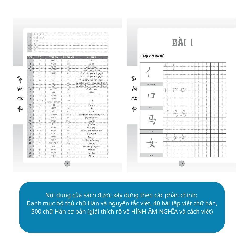 - Phần 1: Danh mục bộ thủ chữ Hán: cung cấp cho các bạn danh mục 214 bộ thủ chữ Hán, không chỉ bao gồm cách viết, tên bộ, phiên âm và ý nghĩa tiếng Việt.