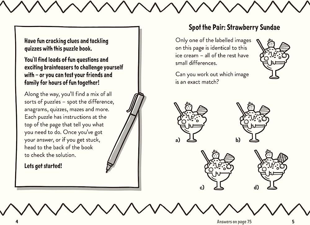 Hãy kiểm tra kiến thức của bạn trong cuốn sách câu đố và đố vui đầy thú vị này! Hãy chú ý phát hiện sự khác biệt, mê cung, câu đố tìm chữ và câu đố - và, tất nhiên, các túi câu hỏi đố vui về thể thao, địa lý, không gian, thực phẩm và hơn thế nữa!