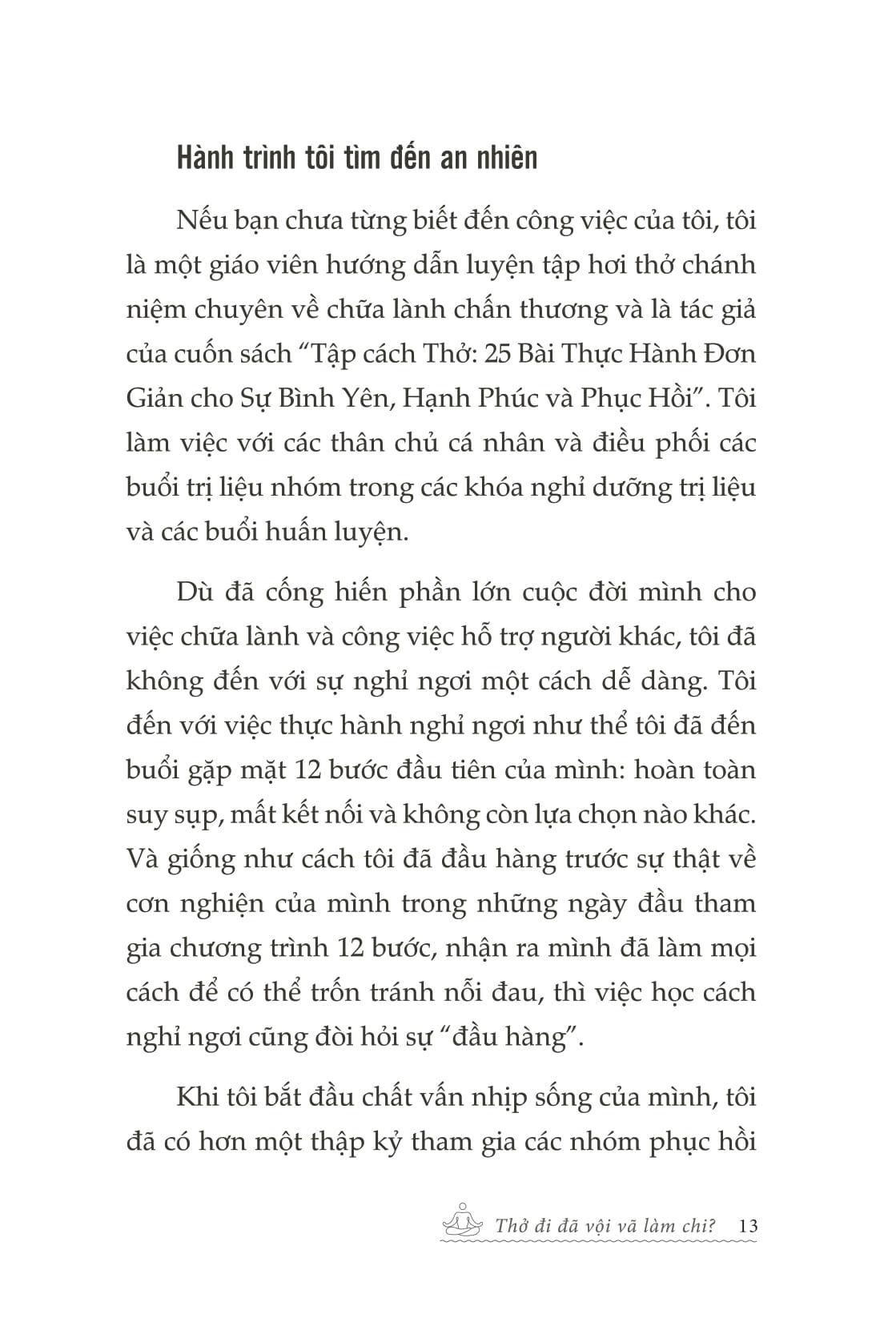 Mua tại TiktokThở Đi Đã - Vội Vã Làm Chi “Thở Đi Đã, Vội Vã Làm Chi” là cuốn sách chữa lành dành cho những ai đang bị cuốn vào vòng xoáy của nhịp sống hiện đại. Với lời văn nhẹ nhàng, tinh tế và sâu sắc, cuốn sách nhắc nhở chúng ta về một điều tưởng chừng rất đơn giản nhưng lại dễ bị lãng quên: hít một hơi thở chậm, và sống thật sự với hiện tại. Không giáo điều, không hô hào, sách như một người bạn thủ thỉ bên tai, khơi gợi cảm giác bình yên từ những điều nhỏ bé quanh m.ình. Nội dung chính của cuốn sách Cuốn sách gồm nhiều đoạn tản văn ngắn, mỗi chương là một lời nhắc nhở dịu dàng để ta quay về với chính m.ình. Nội dung tập trung vào các chủ đề: