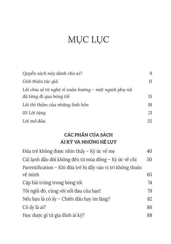 Các chương trong sách không đi theo trình tự thời gian, mà được chia theo chủ đề tâm lý học và hành vi, giúp người đọc dễ dàng nhận ra chính m.ình (hoặc người thân) trong những tình huống tưởng chừng “bình thường” của đời sống gia đình: