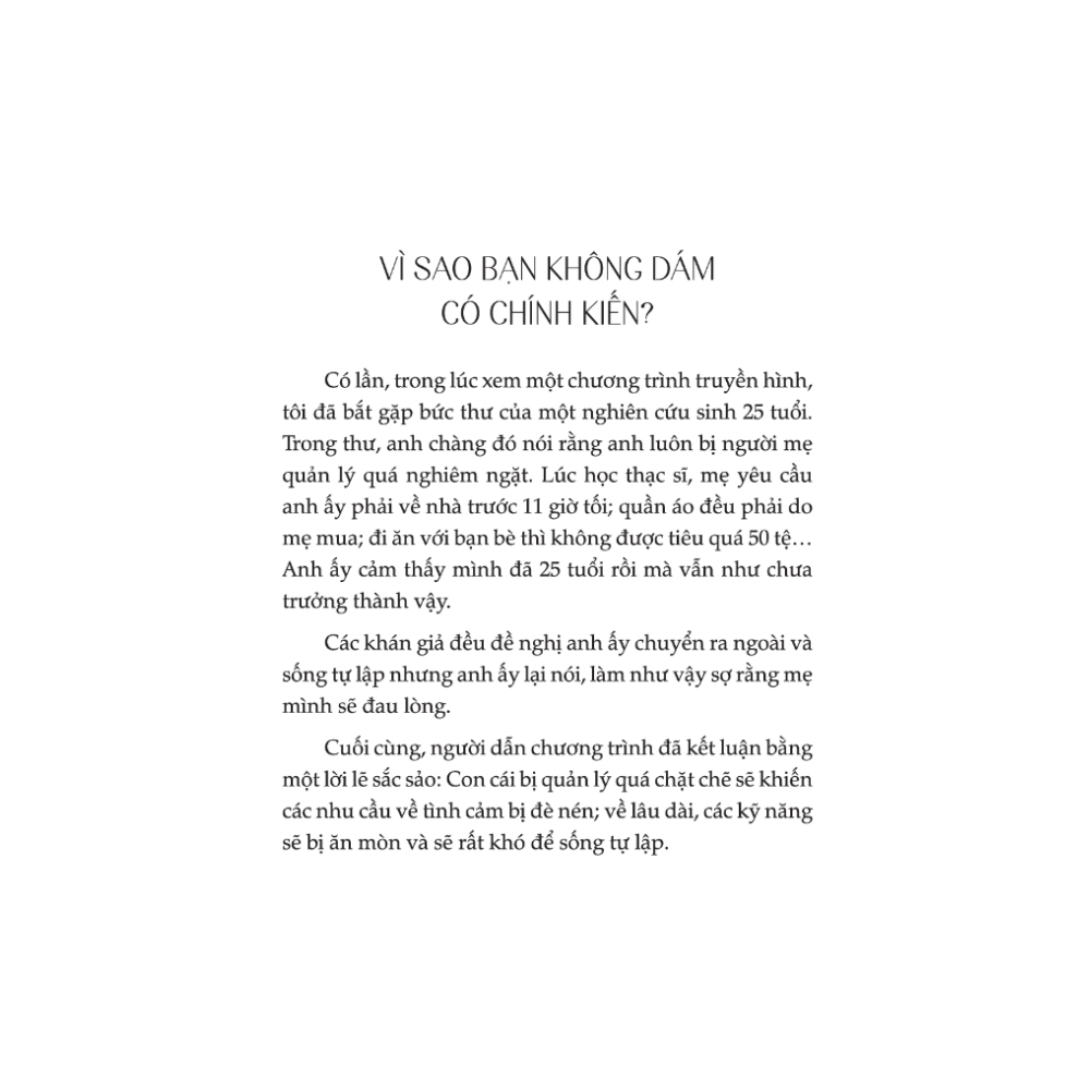 Cuốn sách này đi sâu phân tích những nguyên nhân sâu xa dẫn đến lối sống thụ động của chúng ta: không quan tâm đúng mức đến nhu cầu và cảm xúc của bản thân; sợ xung đột với người khác; phụ thuộc quá nhiều vào thế giới bên ngoài; ý chí cá nhân không được tôn trọng.