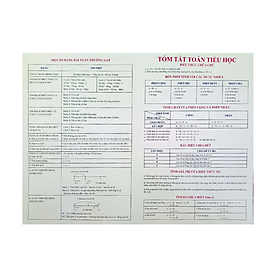Mua tại TiktokGIỚI THIỆU BẢNG TÓM TẮT CÔNG THỨC TOÁN TIỂU HỌC ❖Công thức toán tiểu học bao gồm các công thức toán cơ bản dành cho học sinh tiểu học ❖ Công thức toán bao trọn tất cả các công thức tính chu vi, diện tích cả hình. Các phương pháp giải các dạng toán đố điển hình của tiểu học. ❖ Tài liệu được in màu, cán bóng, có nếp gấp, là tài liệu hữu ích dành cho học sinh tiểu học.