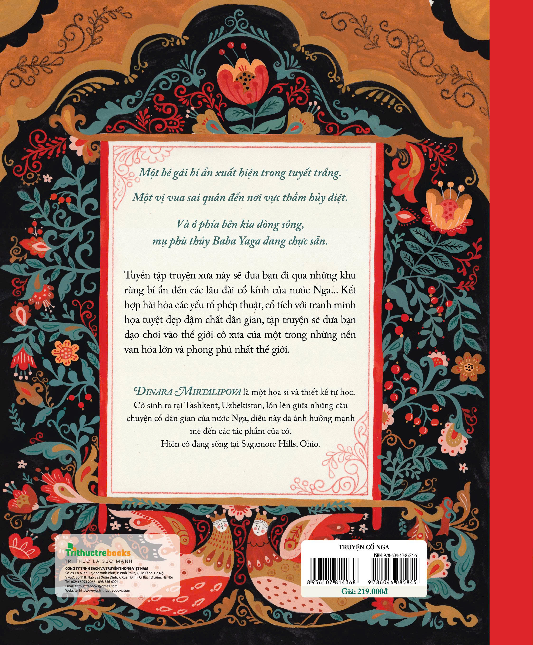 - GIỚI THIỆU VỀ CUỐN SÁCH Truyện dân gian Nga luôn giữ một vị trí đặc biệt trong lòng những người yêu cổ tích. Những nhân vật huyền thoại như Baba Yaga hay Chim Lửa đã làm say đắm biết bao thế hệ độc giả. Tuyển chọn những câu chuyện dân gian và cổ tích đặc sắc nhất của Nga và các dân tộc Slavơ, được sưu tầm và dịch thuật vào cuối thế kỷ XIX - đầu thế kỷ XX, trong tuyển tập Truyện cổ Nga này, bạn sẽ có dịp gặp lại những câu chuyện quen thuộc cùng khám phá thêm những “viên ngọc” mới mẻ. Các trang sách sẽ đưa bạn bước vào hành trình qua những khu rừng huyền bí, ghé thăm các lâu đài cổ kính của nước Nga. Bên cạnh những trang truyện ma mị như Người lính và Thần Chết hay Thợ rèn và Ác ma, độc giả còn bắt gặp những câu chuyện nhân văn giàu ý nghĩa như Nỗi buồn, Vasilisa với bím tóc vàng hay Bảy anh em nhà Simeon. Đó là một thế giới nơi lòng dũng cảm, trí tuệ, tình yêu và cả những thử thách siêu nhiên luôn song hành. Truyện cổ Nga sẽ giúp bạn mở ra cánh cửa bước vào kho tàng văn hóa phong phú của Nga và mở rộng ra là các dân tộc Slavơ, đồng thời còn là hành trình đưa bạn dạo chơi trong những câu chuyện kỳ diệu vượt thời gian, hấp dẫn cả độc giả nhỏ tuổi lẫn người trưởng thành, đặc biệt là những ai yêu thích cổ tích, thần thoại và văn hóa dân gian châu Âu. Đặc biệt, cuốn sách có những minh họa tuyệt đẹp mang đậm hơi thở văn hóa Nga của họa sĩ Dinara Mirtalipova, mỗi câu chuyện không chỉ khơi dậy trí tưởng tượng mà còn mở ra một cánh cửa để bạn dạo bước trong thế giới cổ xưa của một trong những nền văn hóa phong phú bậc nhất thế giới. Đây là lựa chọn lý tưởng cho bất kỳ ai muốn bổ sung thêm vào kệ sách của mình những tác phẩm giàu giá trị về văn hóa, thần thoại và truyền thuyết dân gian.