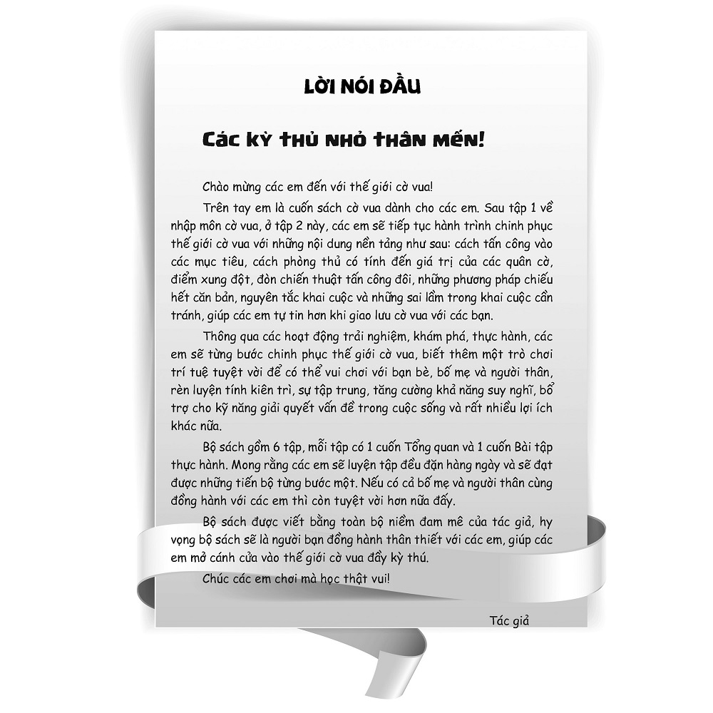 - Tập 2 bao gồm 18 bài học gồm kiến thức cơ bản.- Sách có nhiều hình ảnh minh hoạ ngộ nghĩnh, các trò chơi vui vẻ, tích hợp với cờ vua, minigame, các câu chuyện cờ vua, danh ngôn tạo động lực học tập...