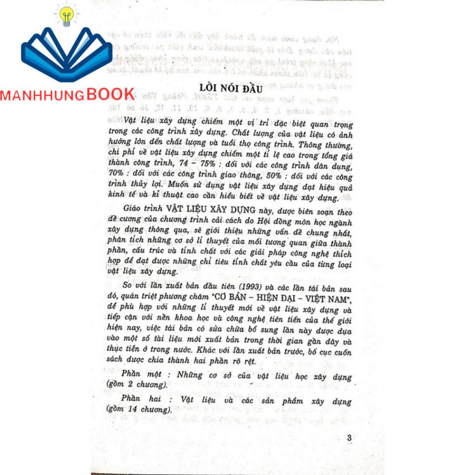 Giáo trình VẬT LIỆU XÂY DỰNG này, được biên soạn theo đề cương của chương trình cải cách do Hội đồng môn học ngành xây dựng thông qua, sẽ giới thiệu những vấn đề chung nhất, phân tích những cơ sở lí thuyết của mối tương quan giữa thành phần, cấu trúc và tính chất với các giải pháp công nghệ thích hợp để đạt vật liệu xây được những cả chỉ tiêu tính chất yêu cầu của từng loại. So với lần xuất bản đầu tiên (1993) và các lần tái bản sau đó, quán triệt phương châm "CƠ BẢN - HIỆN ĐẠI – VIỆT NAM", để phù hợp với những lí thuyết mới về vật liệu xây dựng và tiếp cận với nền khoa học và công nghệ tiên tiến của thế giới hiện nay, việc tái bản có sửa chữa bổ sung lần này được dựa vào một số tài liệu mới xuất bản trong thời gian gần đây và thực tiễn ở trong nước. Khác với lần xuất bản trước, bố cục cuốn sách được chia thành hai phần rõ rệt.