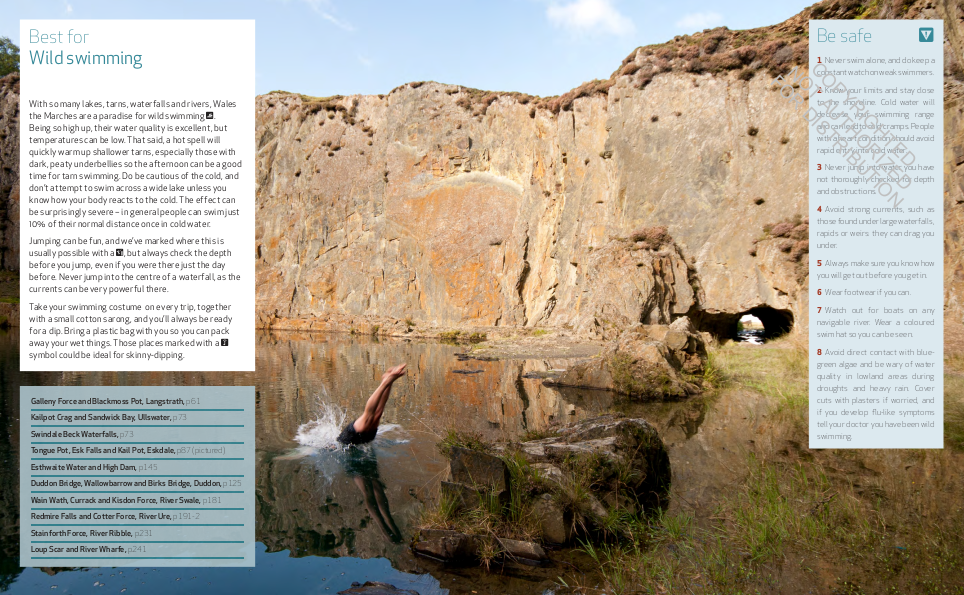 ---------------------------------------- A new compendium of adventures, from the best-selling Wild Guide series (winner of travel guidebook of the year 2015). This guide to Wales and the Welsh Marches, one of Europe's fastest growing adventure holiday destinations, explores the hidden parts of its better known tourist areas, as well many more remote regions, rarely visited by tourists. Guiding you to over 800 wild swims, ancient forests, lost ruins and hidden beaches. Including inns, wild camping, local crafts, artisan whisky distilleries and wild places to stay. Mesmerising photography - a beautiful giftable book. For the discerning explorer, adventurous family and those seeking the ultimate weekend escape. Packed with practical information including GPX co-ordinates and 25 maps