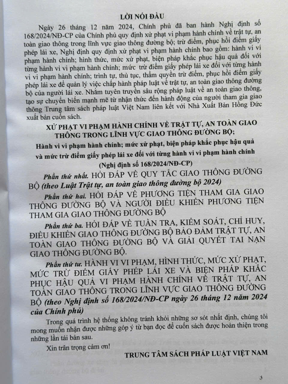 Nhằm phổ biến đến Quý Cơ quan, Đơn vị và Quý khách hàng thân thiết nắm bắt kịp thời những quy định mới nêu trên. Nhà sách Nam Việt xin trân trọng giới thiệu cuốn sách: Xử Phạt Vi Phạm Hành Chính Về Trật Tự, An Toàn Giao Thông Trong Lĩnh Vực Giao Thông Đường Bộ – Hành vi vi phạm hành chính; mức xử phạt, biện pháp khắc phục hậu quả và mức trừ điểm giấy phép lái xe đối với từng hành vi vi phạm hành chính (Nghị định số 168/2024/NĐ-CP)