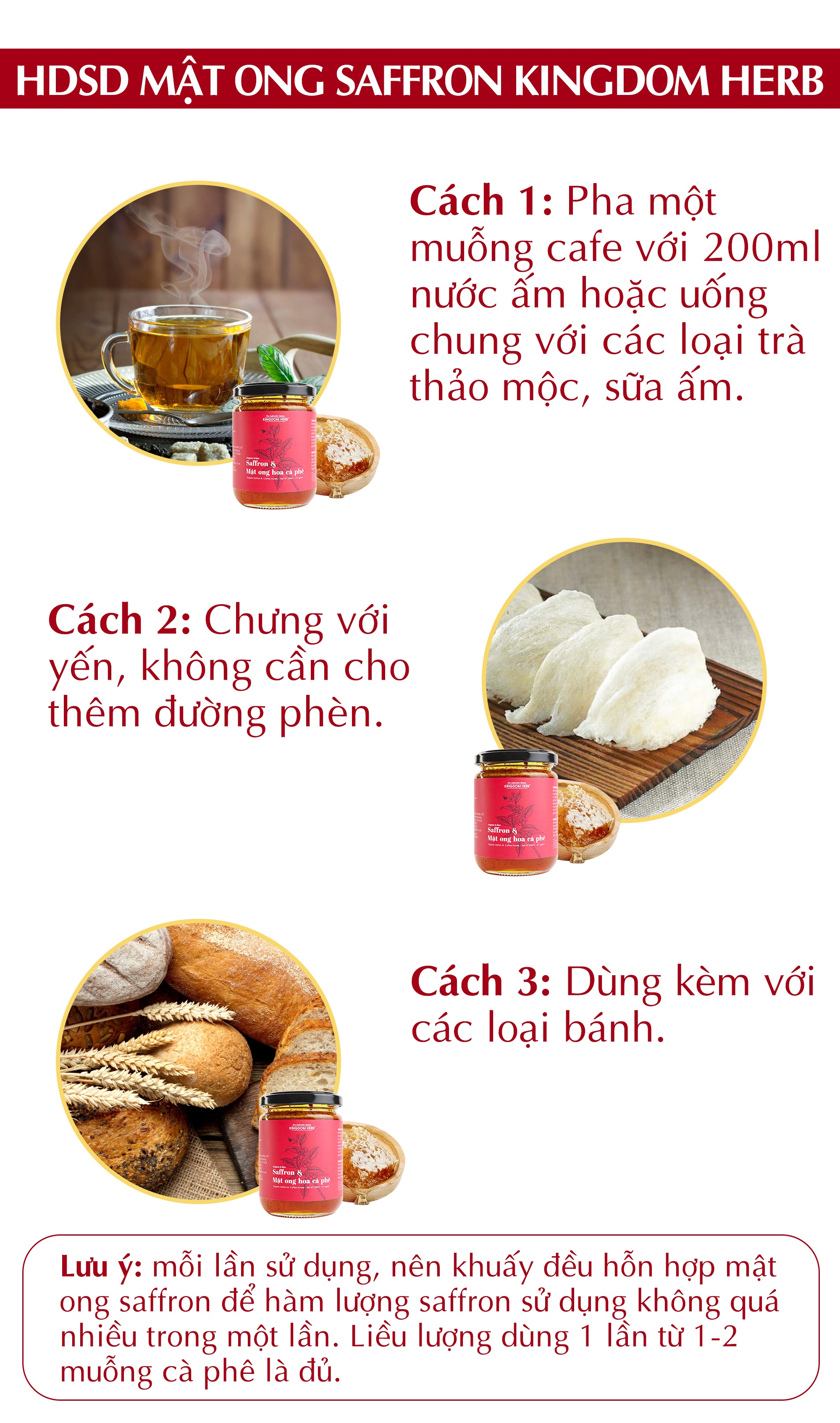 Cách dùng mật ong nhụy hoa nghệ tây saffron Kingdom (xem trên album hình ảnh):