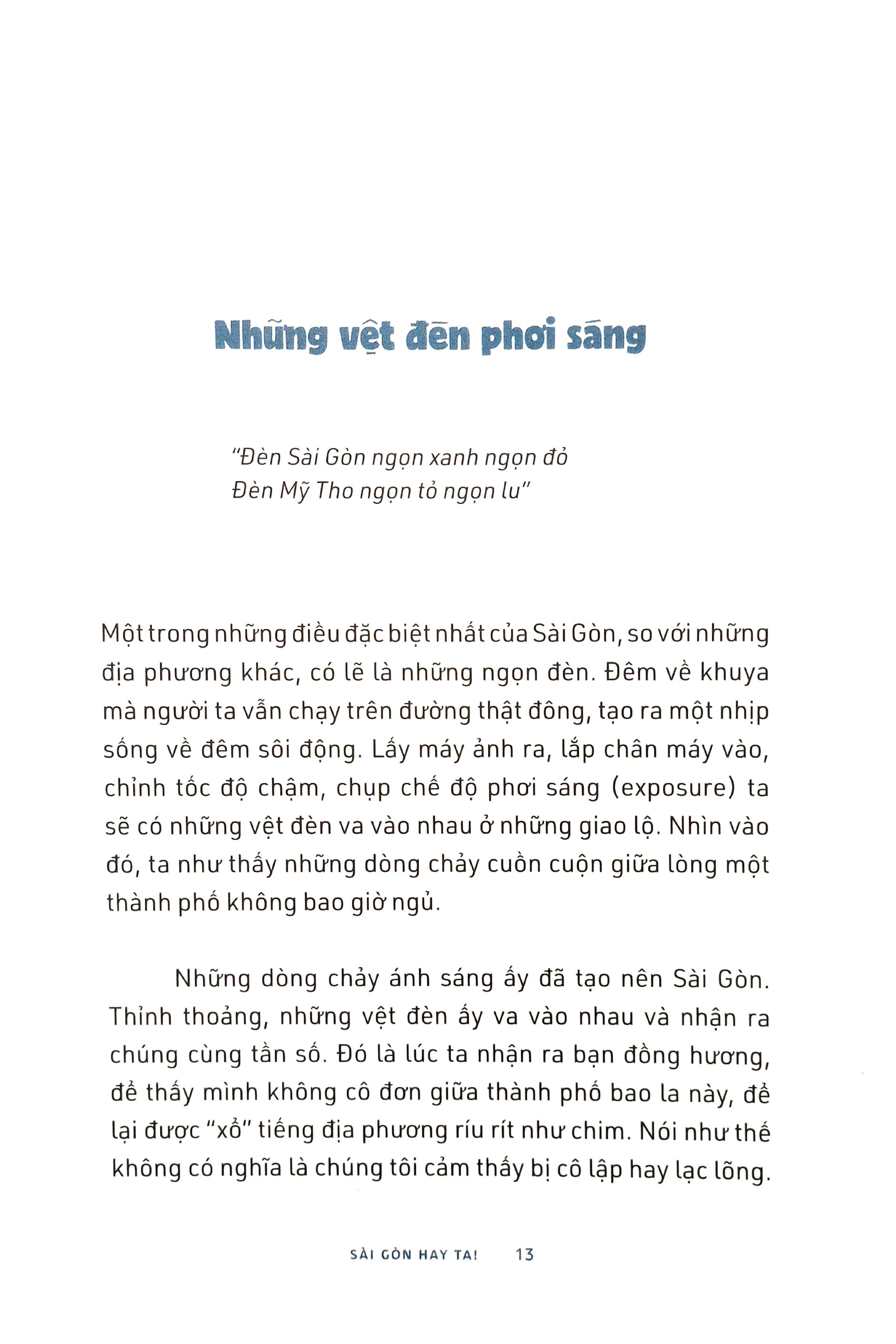 "Ở thành phố này, không ai buồn quá lâu đâu. Nghe thành phố thở đi, trong hơi thở đó có người Nghệ An, người Hà Nội, người Huế, người Hoa, người Khmer, người Hàn, người Mỹ Trong hơi thở đó có ta, có mình. Một thành phố tổng hợp mà không ô hợp, một thành phố xóa đi bản ngã, để dù có gốc gác ở nơi nào đi nữa cũng có thể nói tôi là người Sài Gòn.”