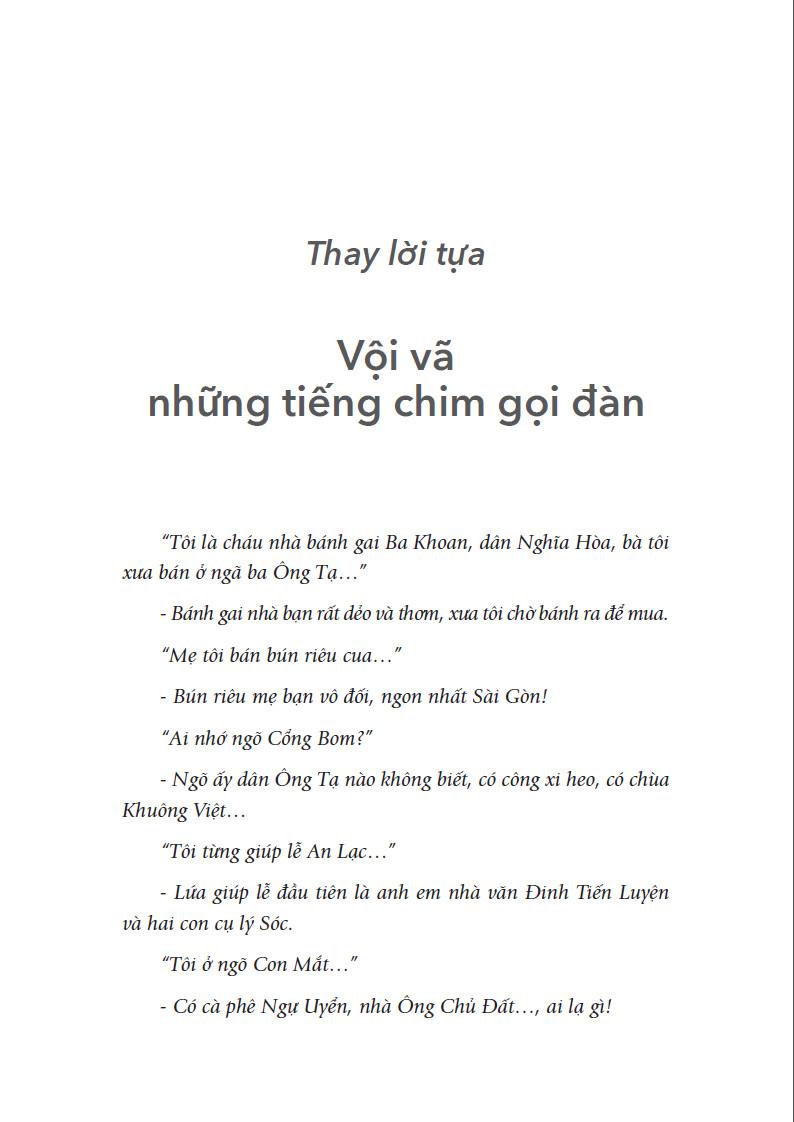 Quyển sách mở ra bằng một không khí thân quen và ấm cúng của những ngày cận Tết, với hình ảnh của những sạp bán lá dong, hương vị của kẹo lạc, “thèo lèo cứt chuột” từ ngày 23 tháng Chạp, khung cảnh nhà nhà ngồi canh nồi bánh chưng đêm 30 Tết, tiếng p.háo rền vang vào thời khắc giao thừa và nếp sinh hoạt của bà con Ông Tạ trong những ngày Tết… Đó là những hình ảnh, hương vị và thanh âm gợi một trời ký ức của nhiều thế hệ mà nay đã “phai nhạt mấy màu”.