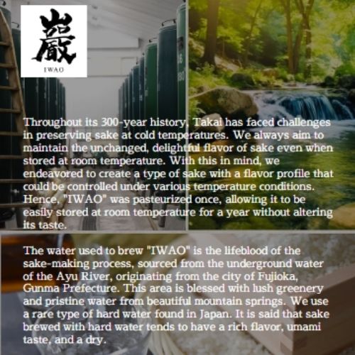 Mua tại TiktokIwao 60 Juichidai Tokubetsu Junmai Loại r'ượu sake này hoàn hảo cho những ai thích trải nghiệm hương vị "Umami", dù dùng lạnh hay ấm, đặc biệt dành cho những ai thích thưởng thức đồ uống nhẹ nhàng vào buổi tối. Với Iwao 60 hy vọng bạn sẽ thưởng thức được hương vị thơm ngon và tận hưởng sự thỏa mãn không giới hạn trong những buổi họp mặt buổi tối. Hâm nóng Iwao 60 bạn sẽ cảm nhận hương vị và mùi thơm sau khi dịu đi sẽ để lại hậu vị như thế nào, nó sẽ gợi nhớ đến mùi hương nở rộ của hoa lan tỏa khắp vòm miệng của bạn.