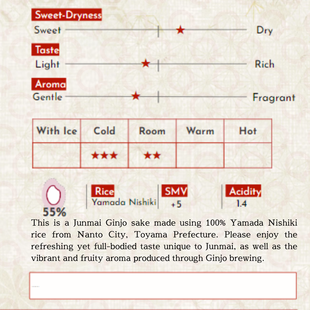 Rượu Sake Daiginjo thượng hạng này được làm bằng gạo Yamadanishiki, thường được biết đến như là "Vua của gạo Sake" vì chất lượng và hương vị đọng lại trên sake. Hạt gạo được mài