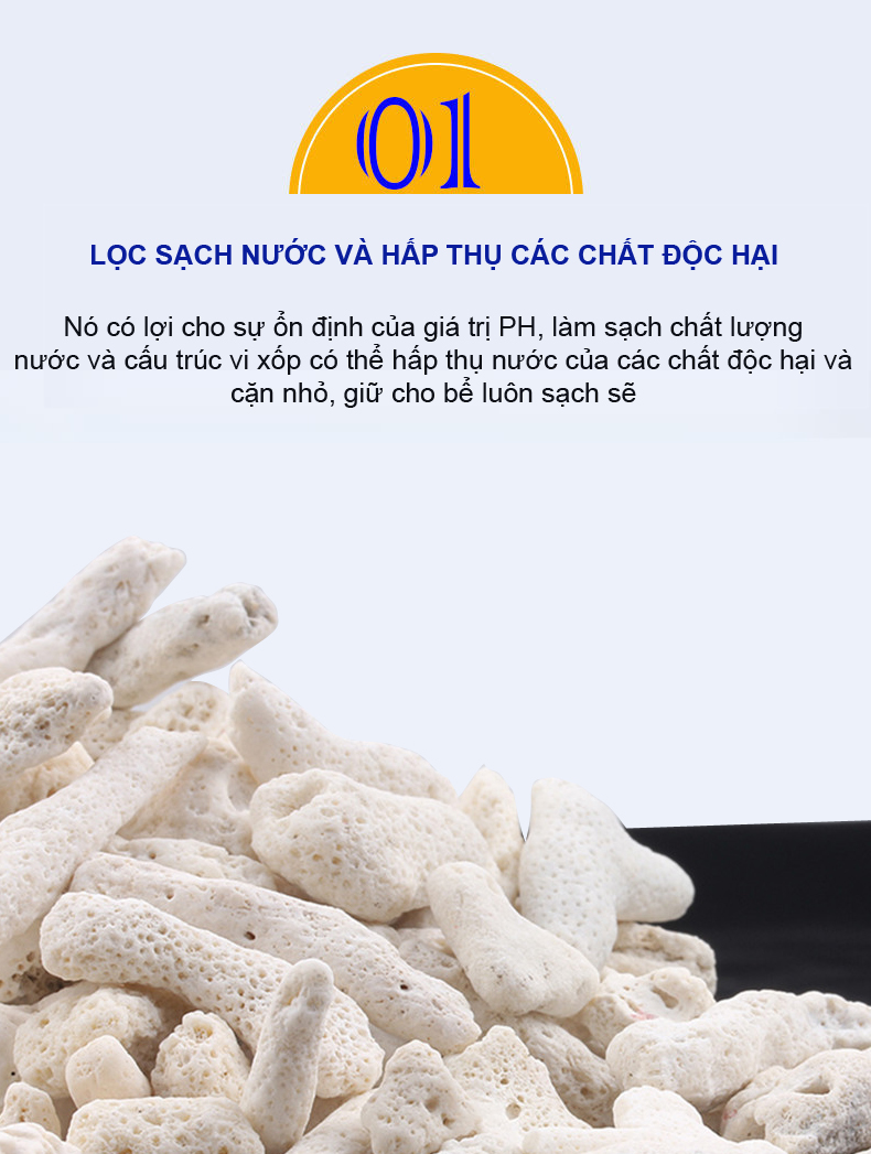 San hô vụn có tác dụng lọc nước cũng như các loại vật liệu gốm lọc hay nham thạch ngoài ra nó còn có tác dụng tăng PH cho nước. phân hủy độc tố trong nước.