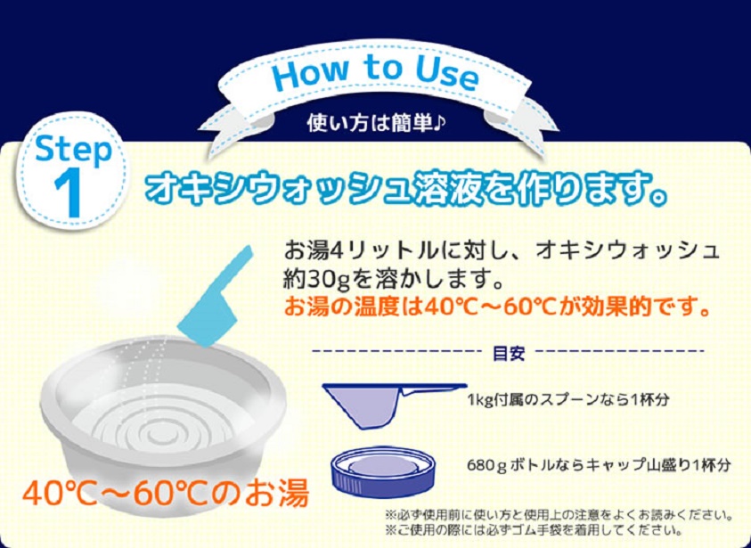 - HDSD: Hòa tan khoảng 30 gram bột OXI WASH vào 04 lít nước ấm hoặc 8g cho 01 lít nước ấm 40~60 độ C, ngâm các đồ vật/ vật dụng cần tẩy trắng vào trong dụng dịch đã pha khoảng từ 5~10 phút sau đó tráng lại bằng nước sạch.