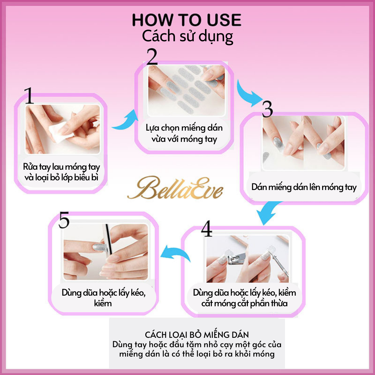 • Có thể để móng tay tự bong hoặc lấy 1 chiếc tăm nhỏ cạy 1 góc   Miếng dán móng tay Bellaeve được nhiều các diễn viễn người mẫu nổi tiếng tại Hàn Quốc sử dụng. Được bán nhiều và rộng rãi trên các kênh Home Shopping tại Hàn Quốc