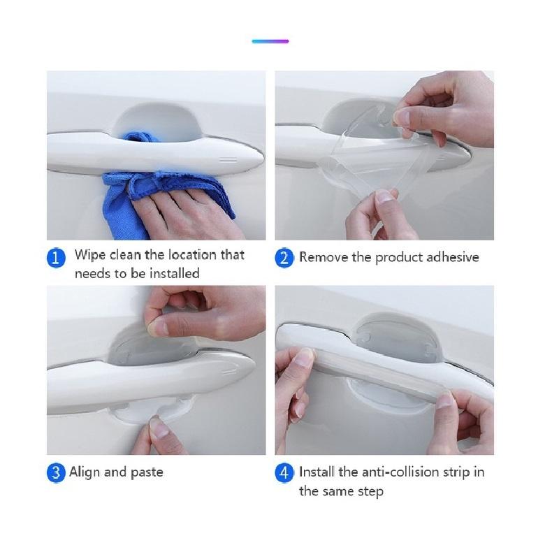 4 Miếng Dán Silicon Chống Xước Hõm Cửa, Tay Nắm Cửa Ô Tô Xe Hơi Bộ 4 miếng dán hõm cửa ô tô Chất liệu PVC mềm dẻo dày 2mm chống xước hiệu quả. Kích thước miếng dán hõm cửa: 9×8cm, tay nắm 15x1,5cm phù hợp dán cho mọi dòng xe. Màu: trong suốt Dễ dàng và đơn giản để lắp đặt. Miếng dán bền chắc với keo 3M siêu dính. Ưu điểm nổi bật: Miếng dán chống xước hõm, tay nắm cửa ô tô được làm từ chất liệu silicone trong suốt, giúp bảo vệ hõm tay nắm cửa ô tô không bị xước, giúp ô tô luôn sáng bóng. Được thiết kế với chất liệu keo dán chắc chắn, không bong tróc khi rửa xe. Sản phẩm dễ dàng sử dụng với thao tác bóc dán, bạn có thể thực hiện ngay tại nhà. Là một trong những vị trí có tiếp xúc nhiều, hõm tay nắm cửa rất dễ bị mòn xước, bong tróc sau thời gian dài. Bạn có thể khắc phục vấn đề này nhanh chóng bằng bộ 4 miếng dán chống xước hõm tay nắm cửa xe cho ô tô. HƯỚNG DẪN SỬ DỤNG: