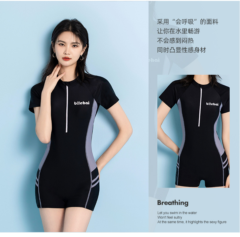 Đồ bơi liền mảnh che bụng thời trang cho nữ Áo có mút sẵn Đen phối xám thanh lịch, Có dây kéo phía trước Có quần đùi liền bên trong váy Chất liệu: Vải thun