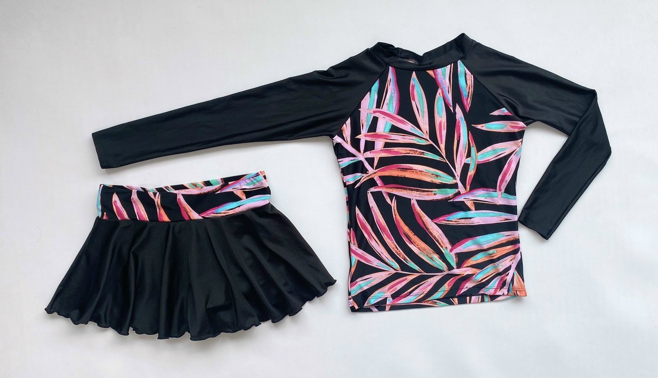 - Mẫu đồ bơi mới nhất cho các bạn nữ thích sự trẻ trung kín đáo mà vẫn thu hút khi đi biển, đi bơi. - Áo dáng ngắn tay phối hoạ tiết trẻ khoẻ,