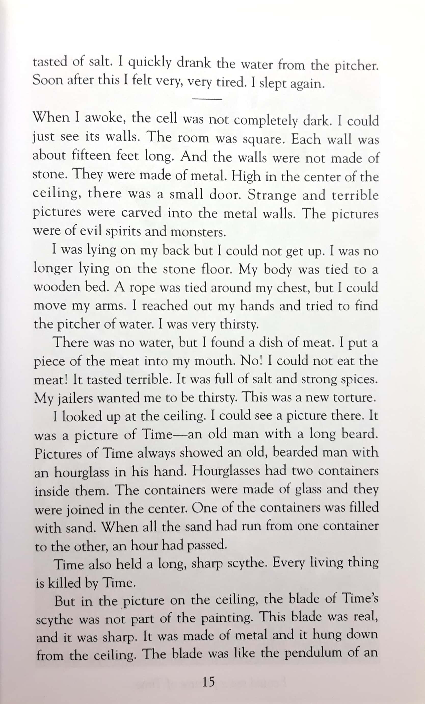 A prisoner wakes up to find himself in a dark cell with a deep pit.