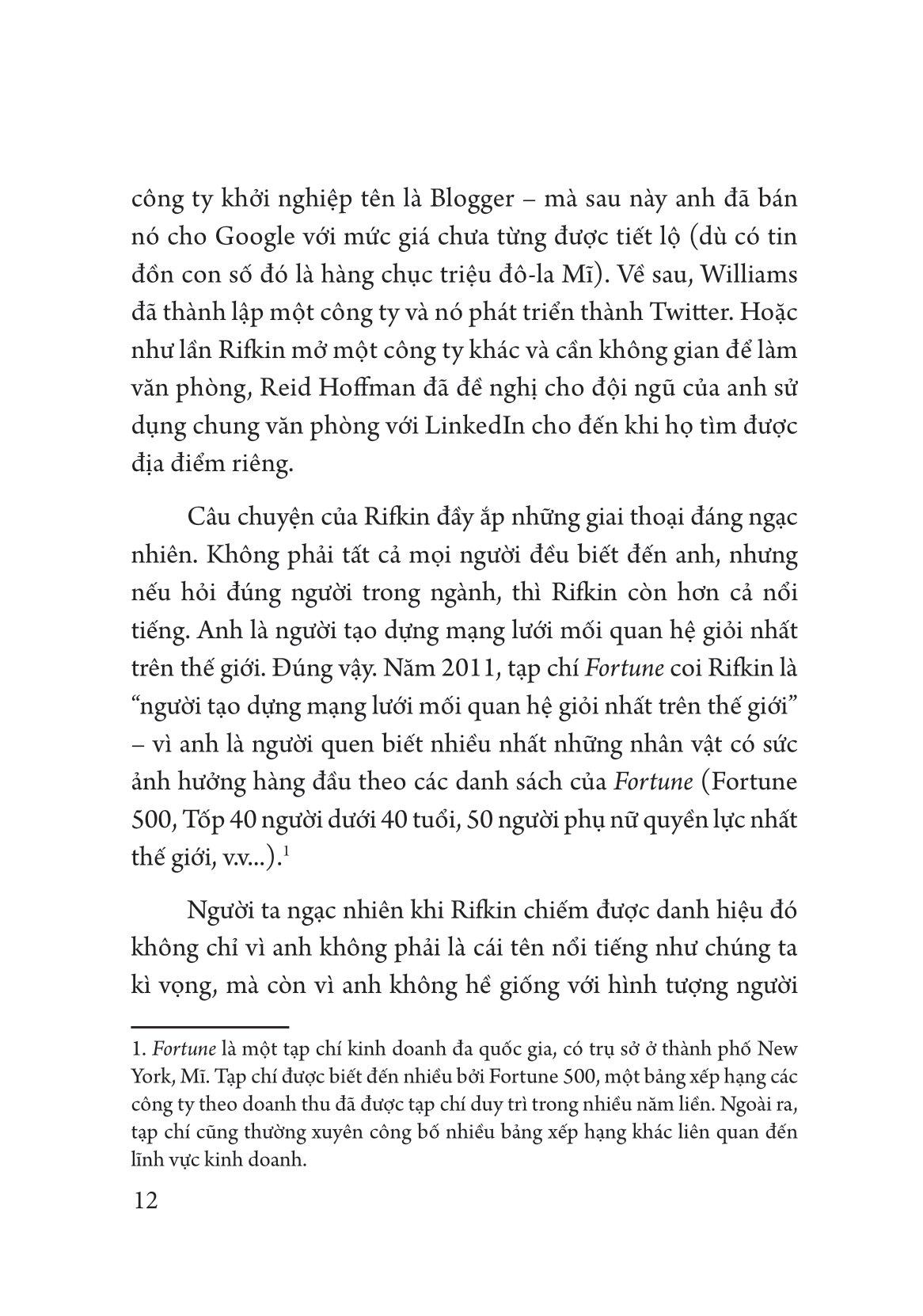 Đây không chỉ là cuốn sách dạy cách kết giao. Cuốn sách này không giống bất cứ cuốn sách dạy kết giao nào mà bạn từng đọc (hoặc đã bỏ qua) trước đó. Đây là một cuốn sách nói về cách mạng lưới vận hành trong thực tế. Sẽ không có những lời khuyên sáo rỗng và những hướng dẫn cụ thể về cách gặp gỡ bạn mới hoặc cách bắt chuyện làm quen. Sẽ không có cách quản lí hay làm đẹp trang mạng xã hội của bạn. Đã có rất nhiều cuốn sách như vậy rồi nên thêm một cuốn nữa cũng chẳng ích gì – hơn thế, chỉ mở rộng số lượng người quen thôi thì không đủ.