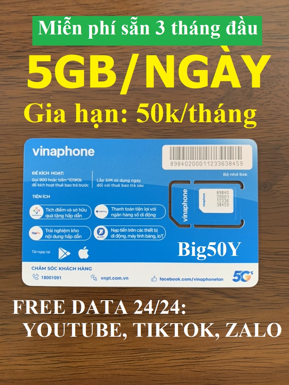 ✨Sim 4G Vinaphone 5GB/NGÀY (Gia hạn 50k/tháng) FREE Toàn bộ Data xem Youtube, Tiktok với tốc độ cao, MAX băng thông, Max dung lượng - Dùng Toàn Quốc - hàng chính hãng