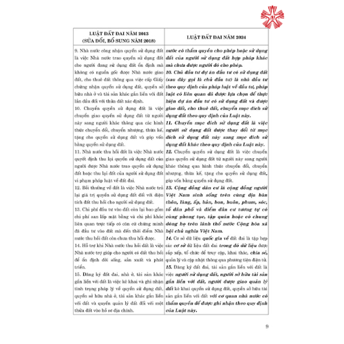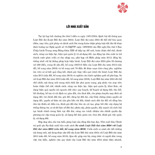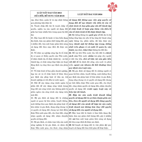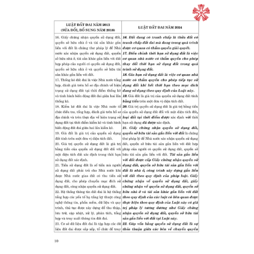 Trong cuốn sách này, Luật Đất đai năm 2024 và Luật Đất đai năm 2013 (sửa đổi, bổ sung năm 2018) sẽ được so sánh dưới hình thức lập bảng. Những nội dung mới, sửa đổi, bổ sung được thể hiện bằng chữ “nghiêng, đậm” để thuận tiện cho việc tra cứu, sử dụng và áp dụng pháp luật.