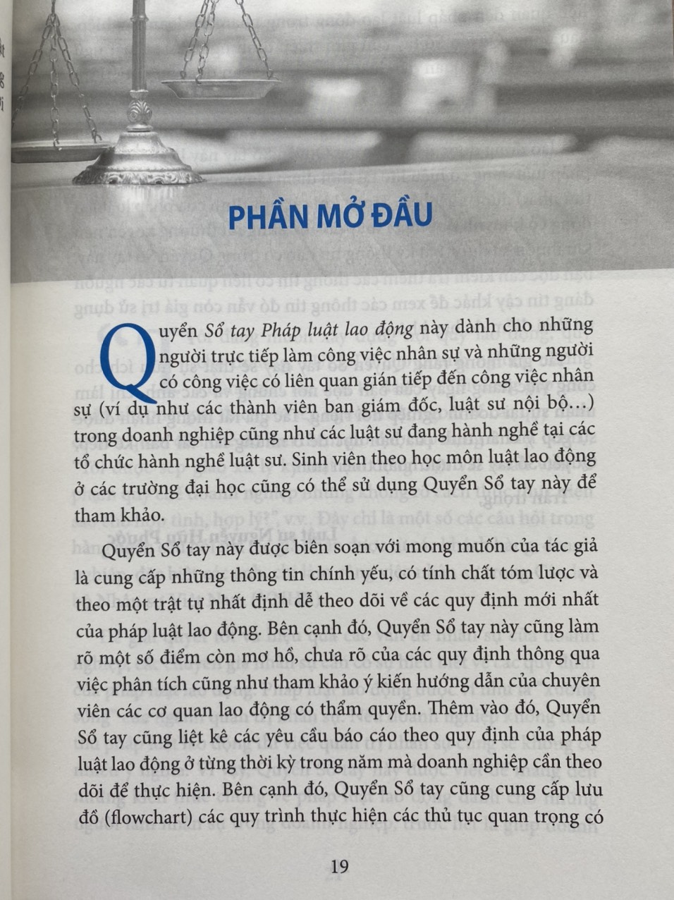 Sổ tay pháp luật lao động này được biên soạn với mong muốn của tác giả là cung cấp những thông tin chính yếu, có tính chất tóm lược và theo một trật tự nhất định dễ theo dõi các quy định của pháp luật lao động Việt Nam. Bên cạnh đó, cuốn Sổ tay này cũng làm rõ một số điểm còn mơ hồ, chưa rõ của các quy định này qua việc phân tích pháp lý và tham khảo ý kiến hướng dẫn của các cơ quan lao động của Việt Nam. Thêm vào đó, Sổ tay cũng liệt kê các yêu cầu báo cáo theo quy định của pháp luật lao động ở từng thời kỳ trong năm mà doanh nghiệp cần theo dõi để thực hiện theo cũng như cung cấp các biểu mẫu báo cáo và các biểu mẫu nhân sự cần thiết khác mà quy định của pháp luật lao động yêu cầu và có cung cấp biểu mẫu hay không cung cấp biểu mẫu. Sổ tay cũng cung cấp lưu đồ (flowchart) các quy trình thực hiện các thủ tục quan trọng có liên quan đến pháp luật lao động trong phạm vi doanh nghiệp.