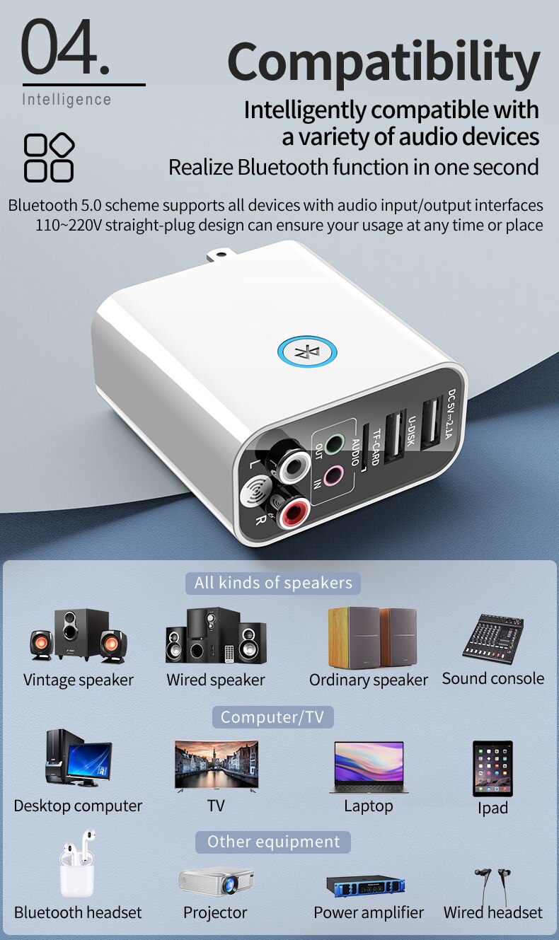 Tính năng: Bộ thu âm thanh tương thích với Bluetooth, bộ chuyển đổi âm thanh kỹ thuật số sang tương tự, bộ điều hợp phát lại đĩa flash USB. Có dây thành không dây, biến