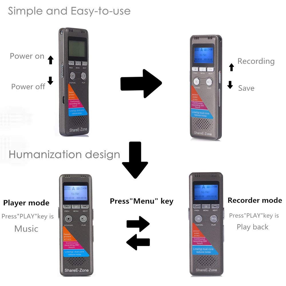 SHAREE-ZONE devotes to offer fashional, unique, useful, high-quality smart easy life electronic accessories All we do is to make technology simpler and more enjoyable for customer. We provide each customer with the manufacturer warranty and superb customer service. Any question or advice, please feel free to contact Shareezone support. Lossless Sound Quality, Simple and Easy-to-use Recording via the built-in microphone or line-in with WAV or MP3 format, WAV format REC Bit Rate up to 512kbps provides you lossless sound quality of recordings. You can monitor recording by simply plug the earphone to listening it while the recording is in progress Supper Long Standby and 48hrs Record Time Built-in 1600mAh Li-ion rechargeable battery provides 48hrs record time . And can charge via a computer USB port or a USB 5V/1A(Max) AC adapter In addition, with 8GB capacity, you don't have to worry about its inadequate memory. A recording pen has nowadays been widely used in meetings, conversations, phone calls, surveillance and so on. You might as well buy one for your own use!