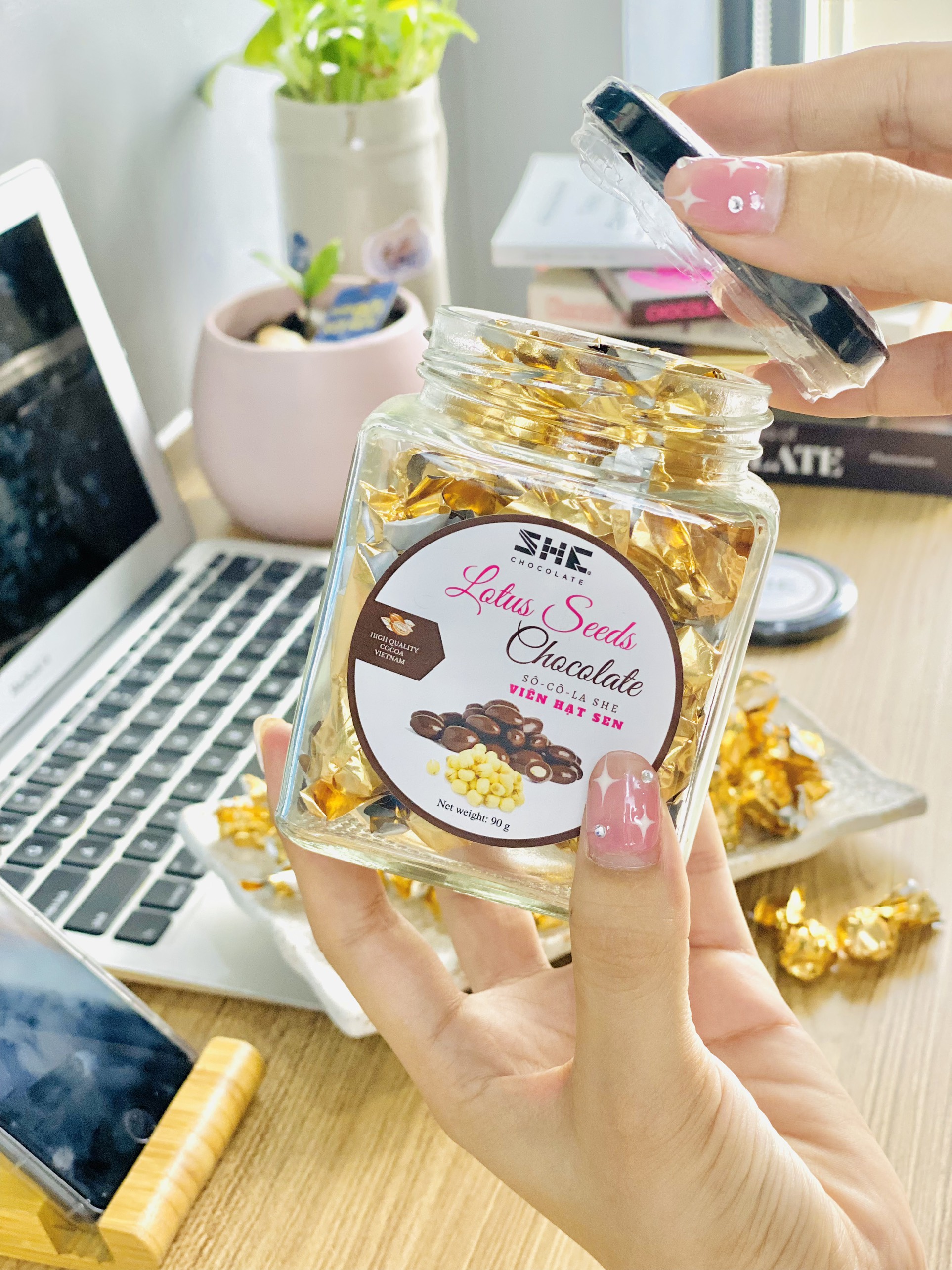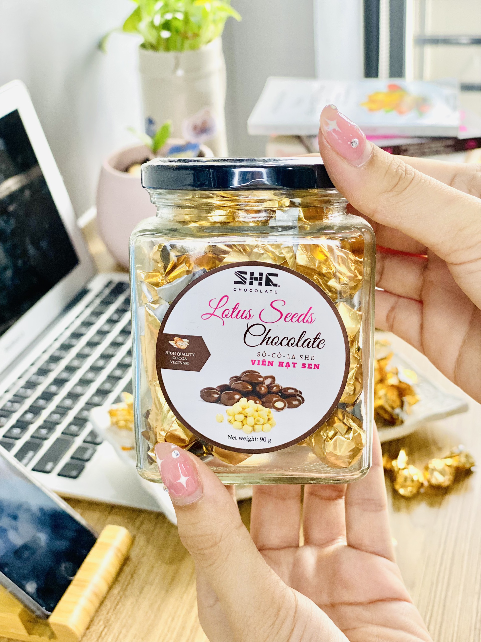 ✨Socola viên Hạt sen - Hũ thủy tinh 90G - SHE Chocolate - Bổ sung năng lượng, đa dạng vị giác. Quà tặng sức khỏe, quà tặng người thân, dịp lễ, thích hợp ăn vặt