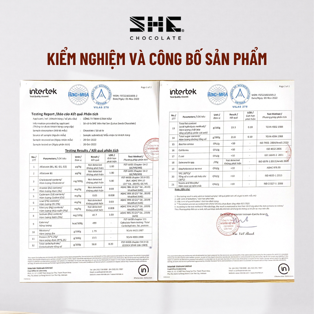 Socola hạt sen sấy giòn SHE Chocolate Socola SHE được làm từ những quả cacao không phân bón và không thuốc bảo vệ thực vật, được chọn lọc rất kỹ từ những nông trại hàng