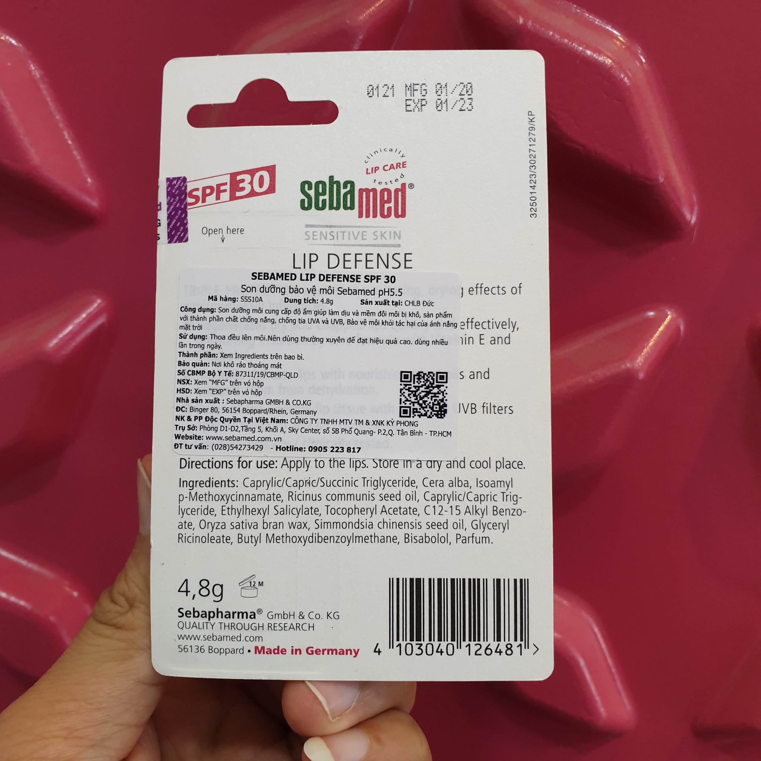 • Không chất bảo quản, không gây kích ứng. Thành phần Sebamed pH5.5 Sensitive Skin Lip Defense: Caprylic/Capric/Succinic Triglyceride, Cera Alba, Isoamyl p-Methoxycinnamate, Ricinus Communis Seed Oil, Caprylic/Capric Triglyceride, Ethylhexyl Salicylate, Tocopheryl Acetate, C12-15 Alkyl Benzoate, Oryza Sativa Bran Cera, Simmondsia Chinensis Seed Oil, Glyceryl Ricinoleate, Sodium Chloride, Sodium Sulfate, CI 77499, Butyl Methoxydibenzoylmethane, Bisabolol, Parfum, CI 73360 Hướng dẫn sử dụng Sebamed pH5.5 Sensitive Skin Lip Defense: