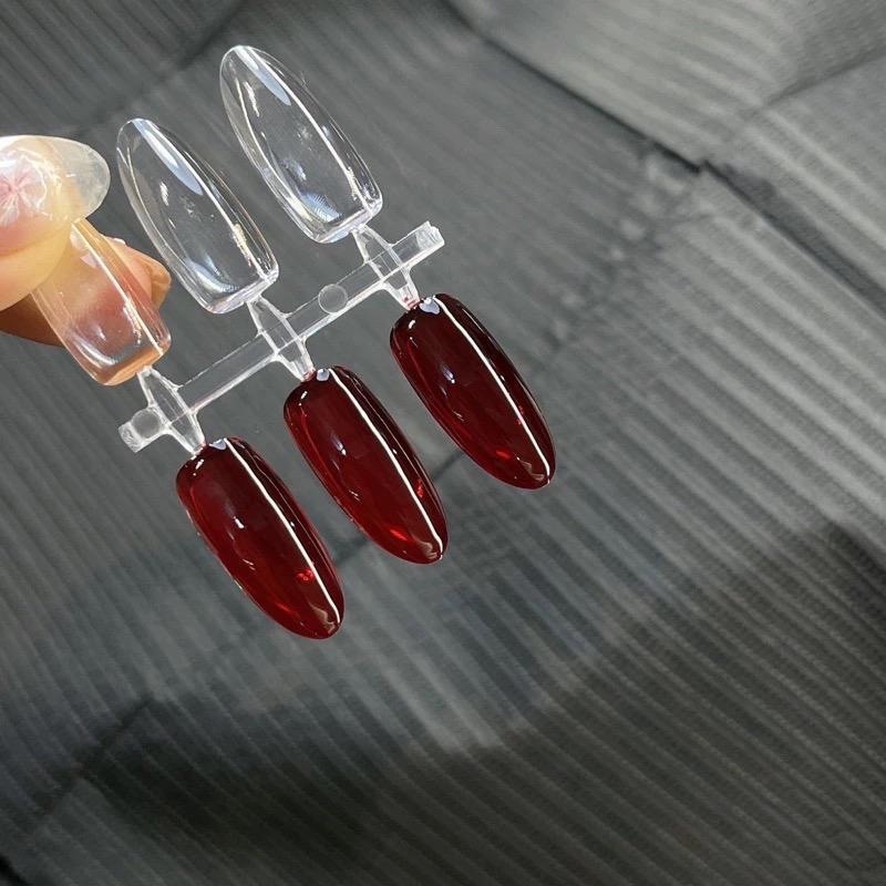 - Bước 2: Sơn 1-2 lớp gel thạch đỏ rượu vang và hơ đèn UV 99s. Nếu muốn màu đậm hơn, có thể sơn thêm lớp thứ 3.