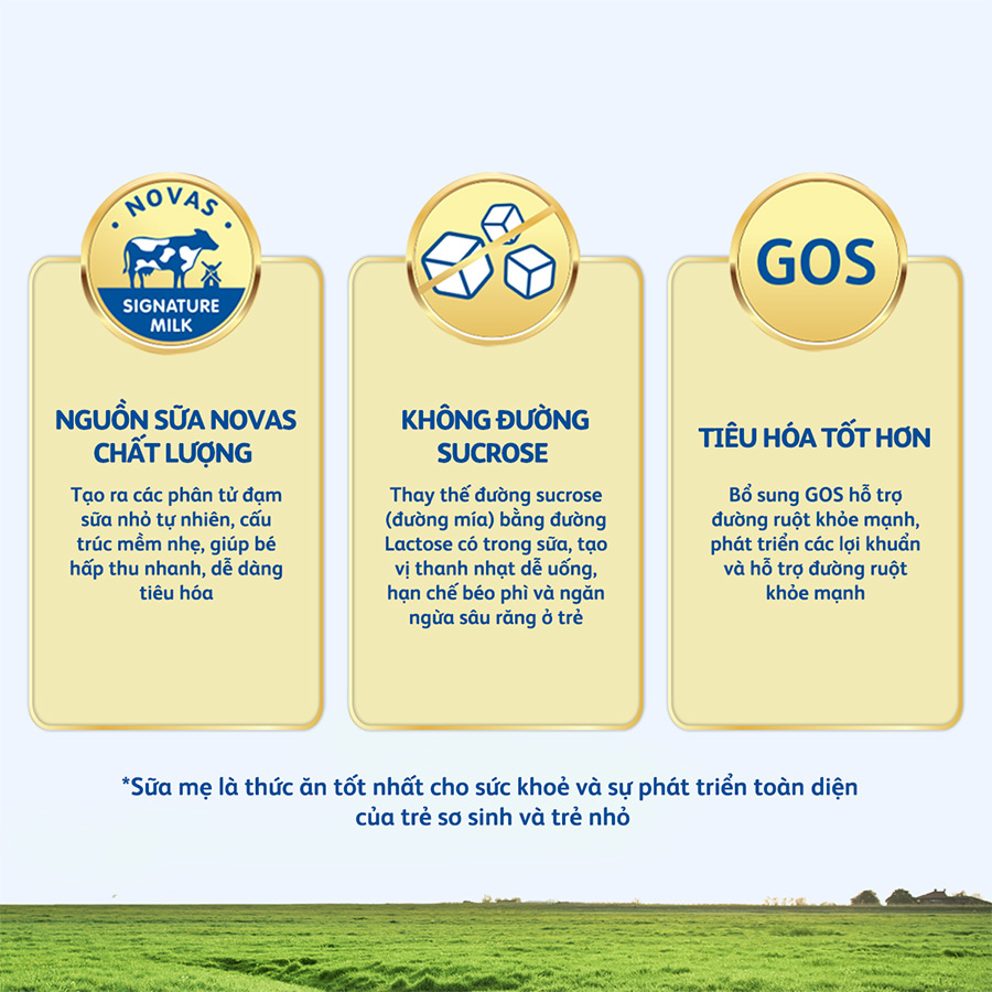 Nguồn sữa NOVAS chất lượng giúp tạo ra các phân tử đạm nhỏ tự nhiên, có cấu trúc mềm nhẹ, hấp thu nhanh và dễ dàng tiêu hóa. Chất xơ GOS thúc đẩy sự phát triển của lợi khuẩn, hỗ trợ đường ruột non nớt của bé.
