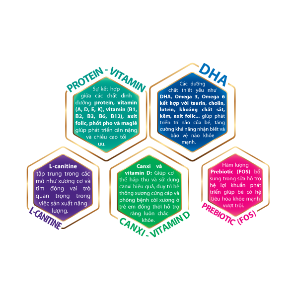 Sự kết hợp giữa các chất dinh dưỡng Protein, Vitamin A - D - E - K, Vitamin B1 - B2 - B3 - B6 - B12, Axít Folic, Phospho, Megie giúp phát triển cân nặng và chiều cao tối ưu.