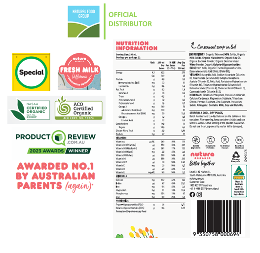 1. Thành phần: Sữa đặc tách béo hữu cơ, sữa đặc hữu cơ, Maltodextrin hữu cơ, dầu đậu nành hữu cơ, bột lactose hữu cơ, bột whey khử khoáng hữu cơ, Galacto-Oligosaccharide (GOS) hữu cơ từ sữa, Fructo-oligosaccharide hữu cơ, acid docosahexaenoic (DHA), (dầu cá). Các vitamin: Acid ascorbic, natri ascorbat (Vitamin C), niacin (vitamin B3), D-alpha tocopheryl acetat (Vitamin E), acid folic, pyridoxin hydroclorid (Vitamin B6), thiamin hydroclorid (Vitamin B1), retinyl acetat (vitamin A), cholecalciferol (Vitamin D), cyanocobalamin (Vitamin B12). Các khoáng chất: calci phosphat, kali clorid, calci carbonat, magnesi sulphat, natri citrat, sắt sulphat, kẽm sulfat, kali iodid.