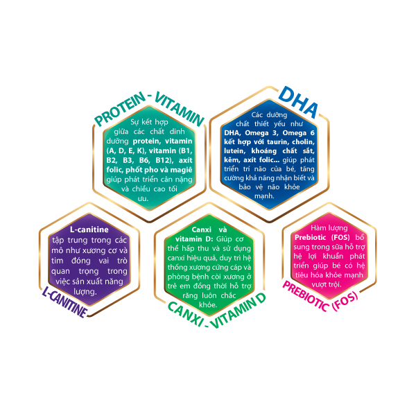 Prebiotic - Hàm lượng Prebiotic (FOS) bổ sung trong sữa hỗ trợ hệ lợi khuẩn phát triển giúp bé có hệ tiêu hóa khỏe mạnh vượt trội.