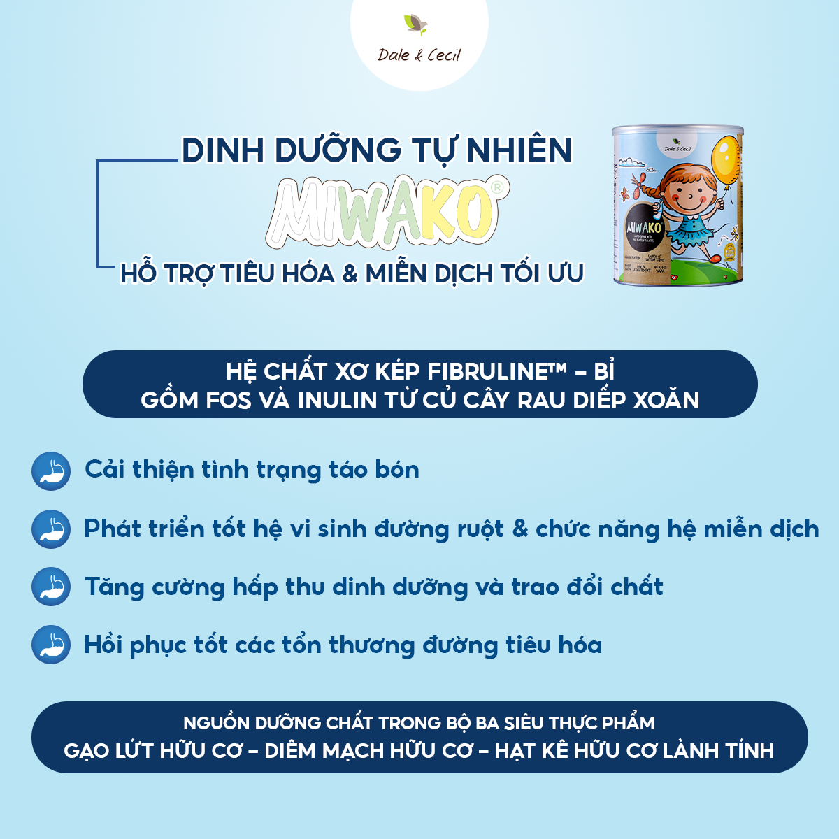 - Ưu điểm lớn nhất của sữa thực vật hữu cơ Miwako là có chứa hàm lượng prebiotic - FOS cao gấp 3 lần sữa thông thường (4,8g/100g) được chiết xuất từ củ cây diếp xoăn và hàm lượng chất xơ đạt 5,8g/100g giúp cho hệ tiêu hóa của bé hấp thụ tốt, đường ruột khỏe mạnh, phòng ngừa táo bón, đầy hơi, khó tiêu.