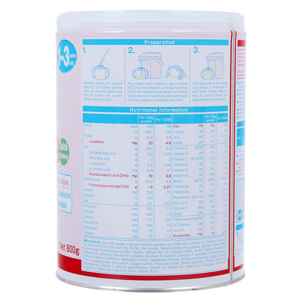 Growing Up Formula 800g phù hợp cho trẻ từ 1-3 tuổi, không chỉ chứa các chất dinh dưỡng cơ bản như protein, chất béo, carbohydrat mà còn có các và khoáng chất rất khó có được từ bò và thức ăn dạng rắn. Meiji còn bổ sung cả axit docosahexaenoic (DHA), các nucleotides và đặc biệt là hệ cân bằng Omega 3, Omega 6 giúp thúc đẩy sự phát triển toàn diện cả về thể chất lẫn não bộ của trẻ trong suốt giai đoạn thơ ấu.