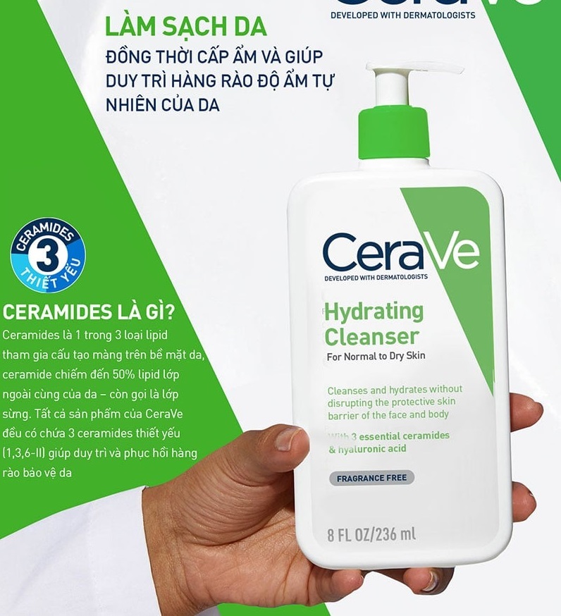 - Sữa rửa mặt Cerave Hydrating Cleanser độ pH5.5 lý tưởng có thể làm sạch nhẹ nhàng mà không làm tổn hại đến lớp màng ẩm của da